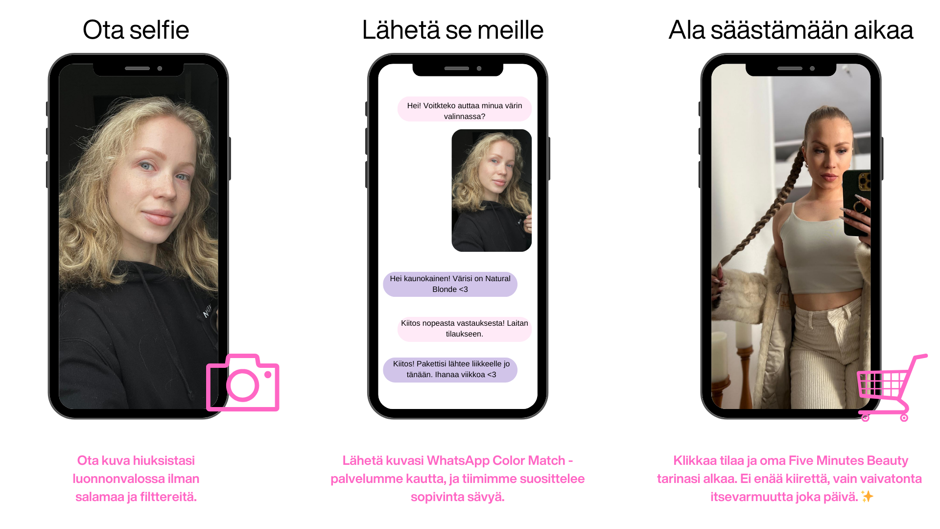 Lähetä meille kuva hiuksistasi luonnonvalossa, niin ammattilaisemme ohjaavat sinut täydelliseen sävymatchiin. Nopeaa ja henkilökohtaista apua saat WhatsAppin kautta alla olevasta painikkeesta. Meillä sinua palvelee aina oikea ihminen.